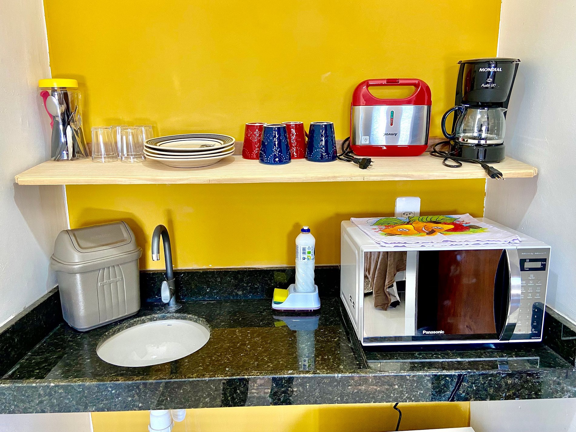 Cada suíte oferece ar-condicionado, varanda, internet, TV Smart, banheiro com box, frigobar, micro-ondas, lancheira, cafeteira, utensílios, camas, mesa e cadeiras. Além de piscina, vaga de carro individual para cada suíte e uma cozinha compartilhada para todos os hóspedes.